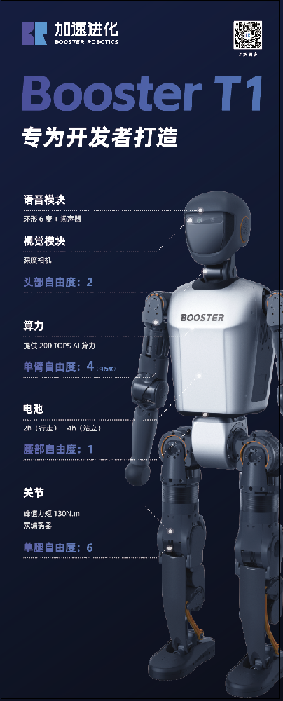 加速进化人形机器人产品Booster T1专为开发者而设计,主打特点是“轻巧灵活、皮实耐摔”。机器人支持全向行走、摔倒爬起、踢球、行走抗扰等运动能力。产品搭载超大AI算力,内置大模型;开发者友好,为开发者提供高效易用的开发工具。产品旨在成为“具身智能”的最佳载体。