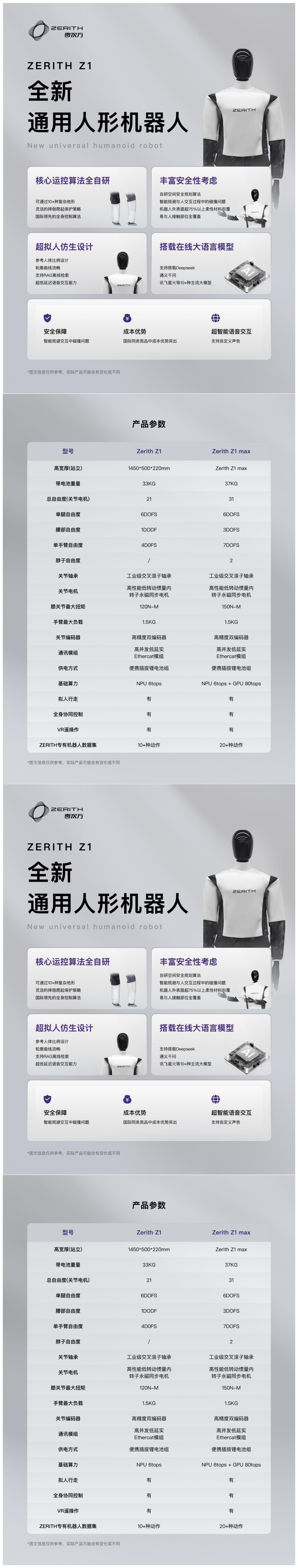 ZERITH Z1是一款全新通用人形机器人,采用超拟人仿生设计,参考人体比例打造流畅轮廓。核心搭载全自研运控算法,配备31个全身自由度实现类人灵活运动,支持10+种复杂地形行走并具备摔倒爬起保护能力。具备超低延迟语音交互与自定义音色功能;通过腕部深度相机及空间安全算法智能规避人机碰撞。