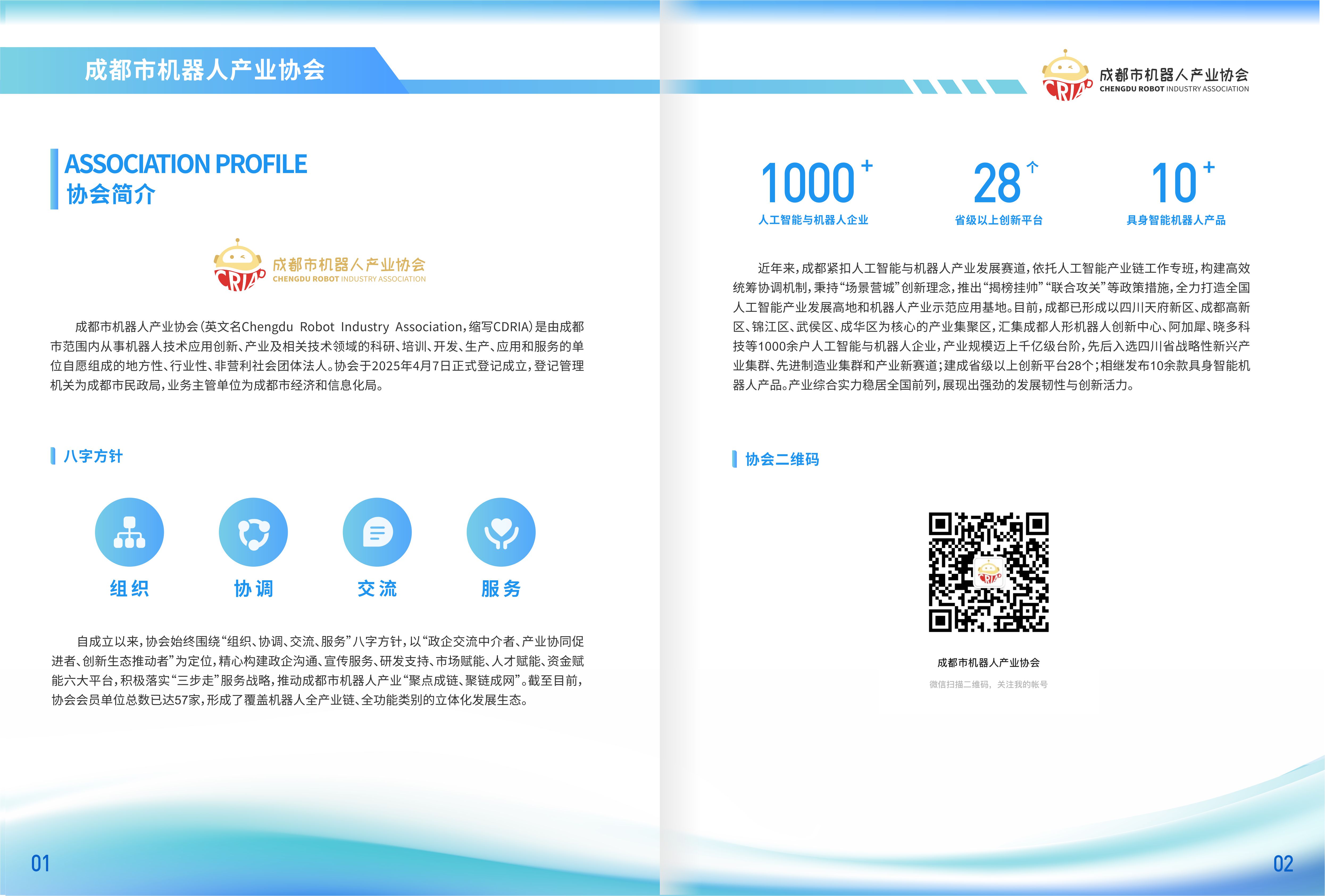 成都市机器⼈产业协会(英⽂名Chengdu Robot Industry Association,缩写CDRIA)是由成都范围内从事机器⼈技术应⽤创新、产业及相关技术领域的科研、培训、开发、⽣产、应⽤和服务的单位⾃愿组成的地⽅性、⾏业性、⾮营利社会团体法⼈。协会于2025年4⽉7⽇正式记成⽴,登记管理机关为成都市⺠政局,业务主管单位为成都市经济和信息化局。