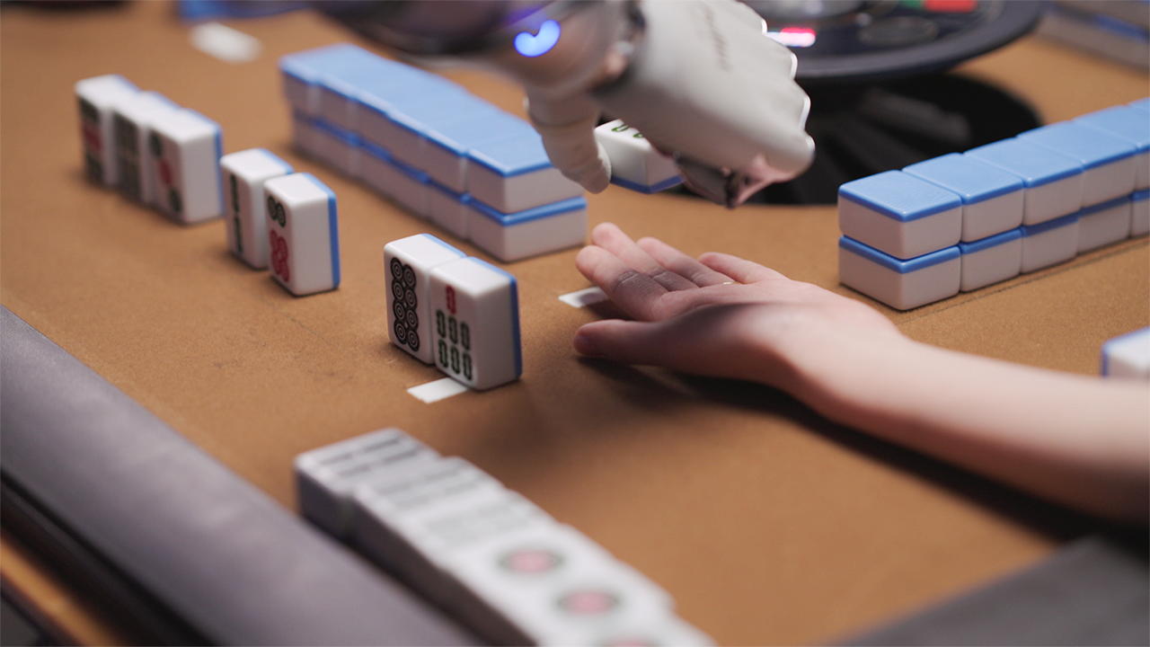 灵初智能麻将机器人与现场观众同桌博弈的场景吸引了众多参观者围观。机器人可与现场观众共同完成30分钟以上的连续麻将对局,以毫米级精度完成摸牌、放置、碰杠等复杂操作,在与人类玩家的实时博弈中展现策略思考,动态构建决策链,自主完成碰杠等博弈决策。观众不仅可以现场观看,更能亲自上桌与机器人对弈,体验机器人如何融合视觉、语言与动作信息,形成游戏博弈和具身操作的融合,展示真正意义上的"会思考的手"。