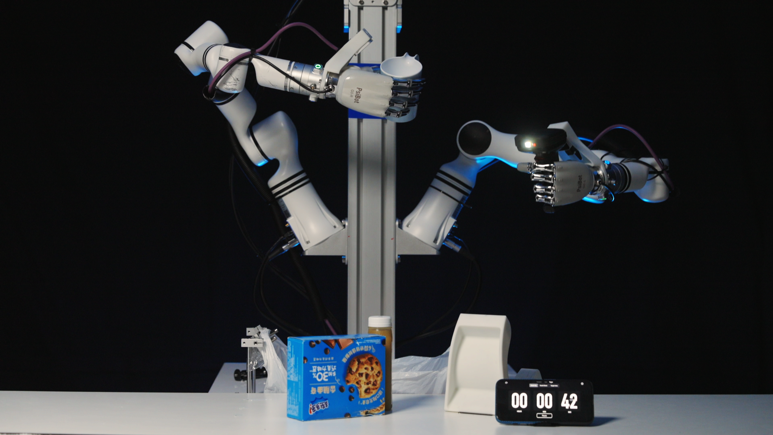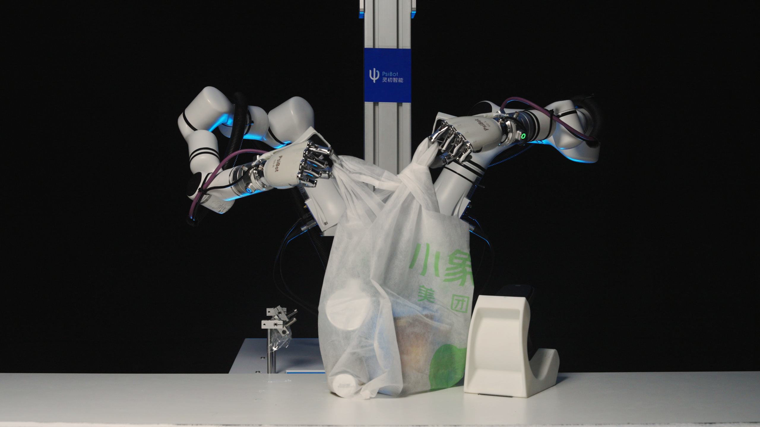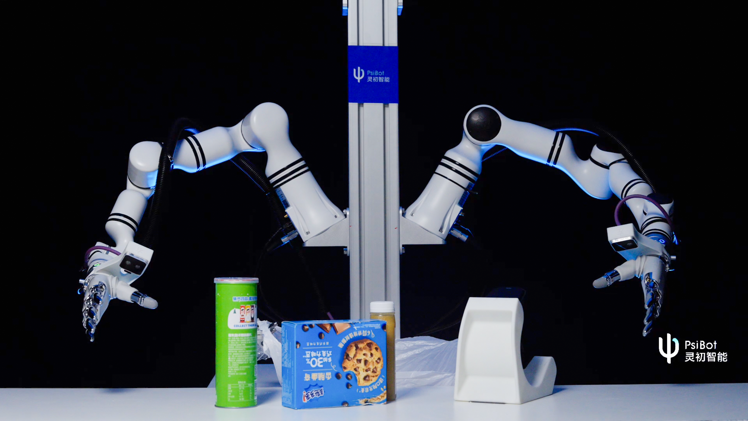 从博弈场景转向实用应用,展会现场的零售打包演示区展现了灵初智能在商业场景中的技术实力。机器人仅接收"将桌面物品打包"的自然语言指令,便可自主分析商品排列、确定操作顺序、完成扫码与装袋动作。整个流程基于VLA模型的分层架构:上层大模型负责理解任务并规划顺序,下层强化学习控制器负责执行动作细节,支持商品级泛化与实时调整,无需逐一标注或人工干预。