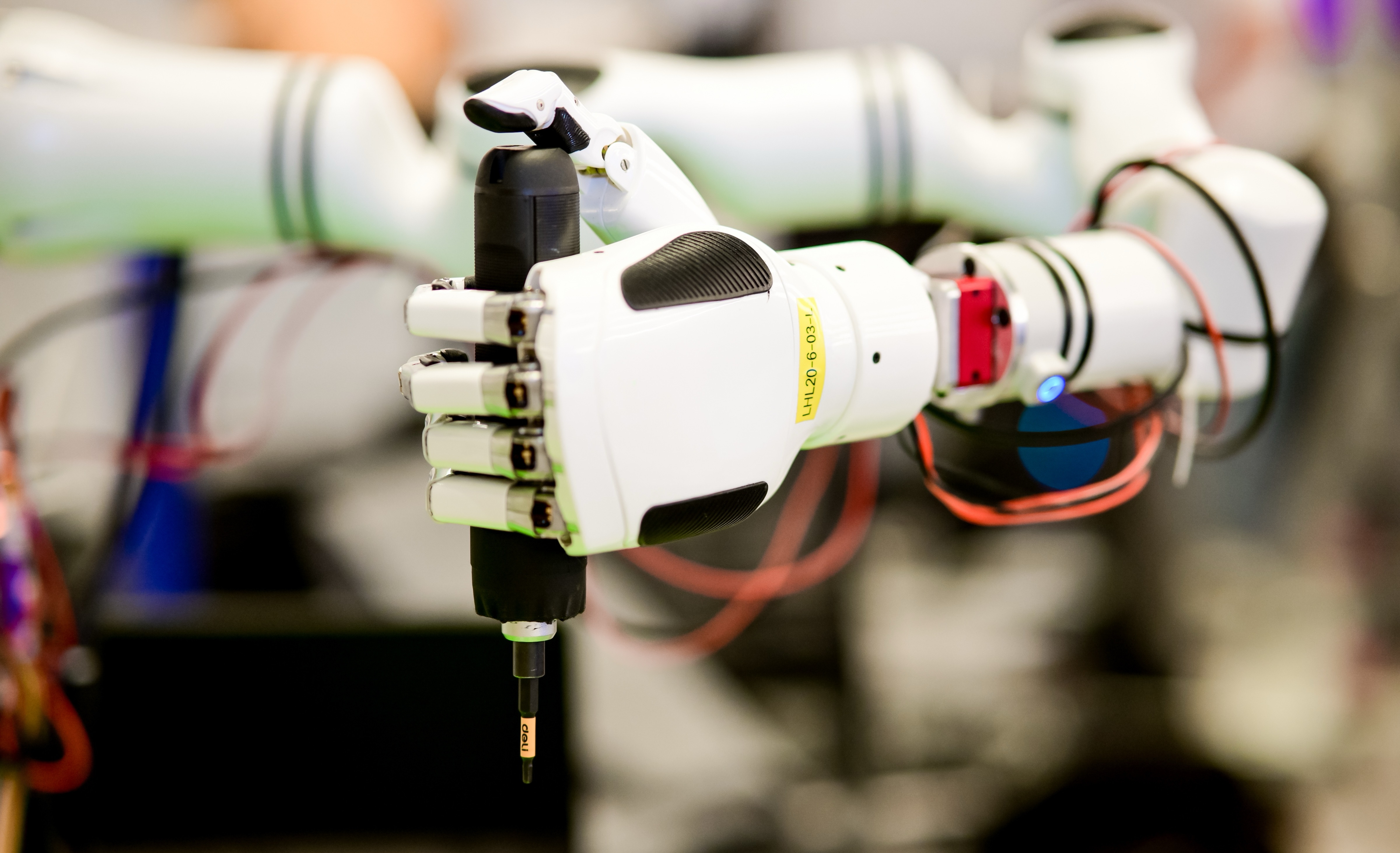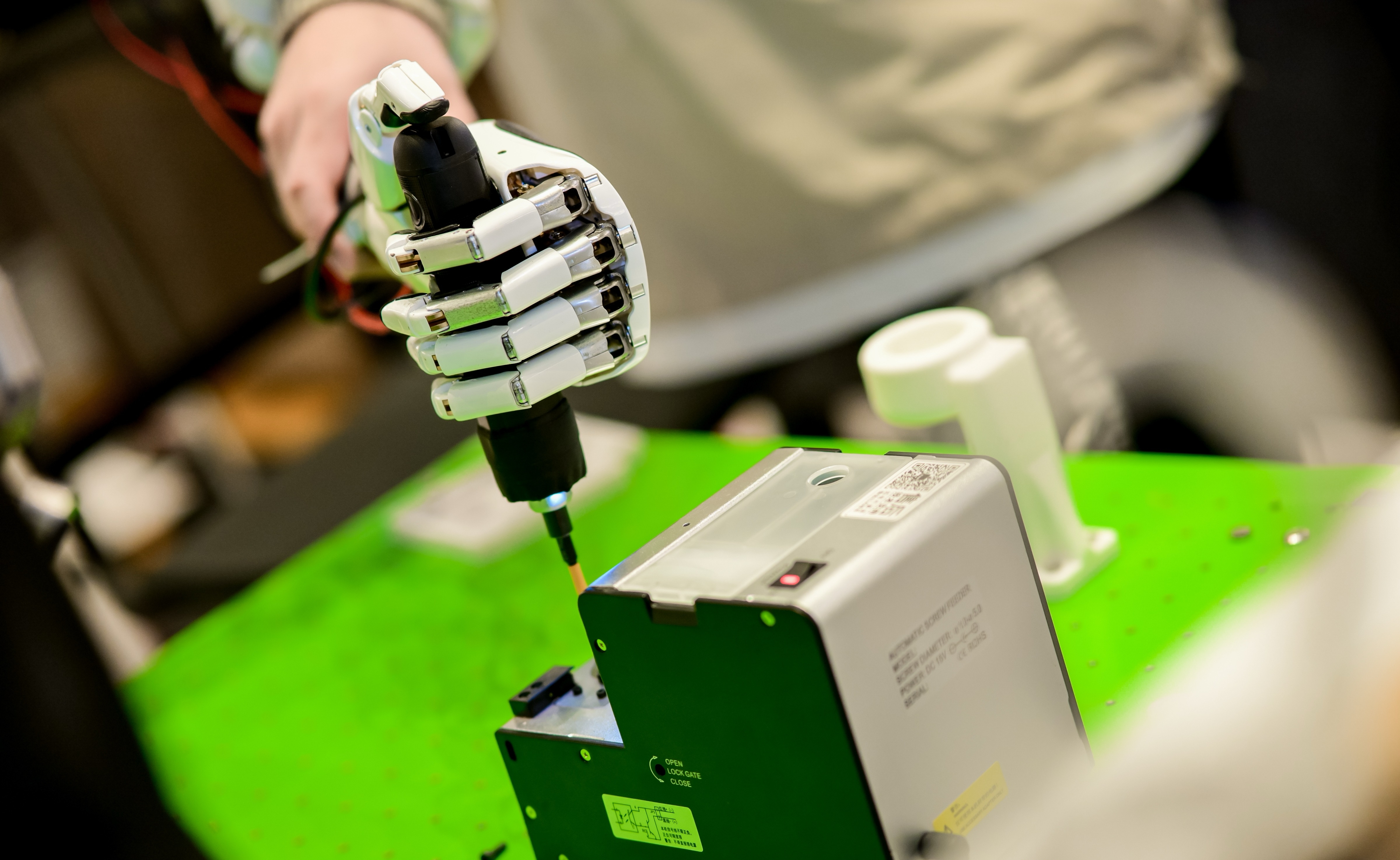 通过灵巧手操作电动螺丝刀进行螺丝的取用、安装和拆卸,进而完成机器人的自我组装
