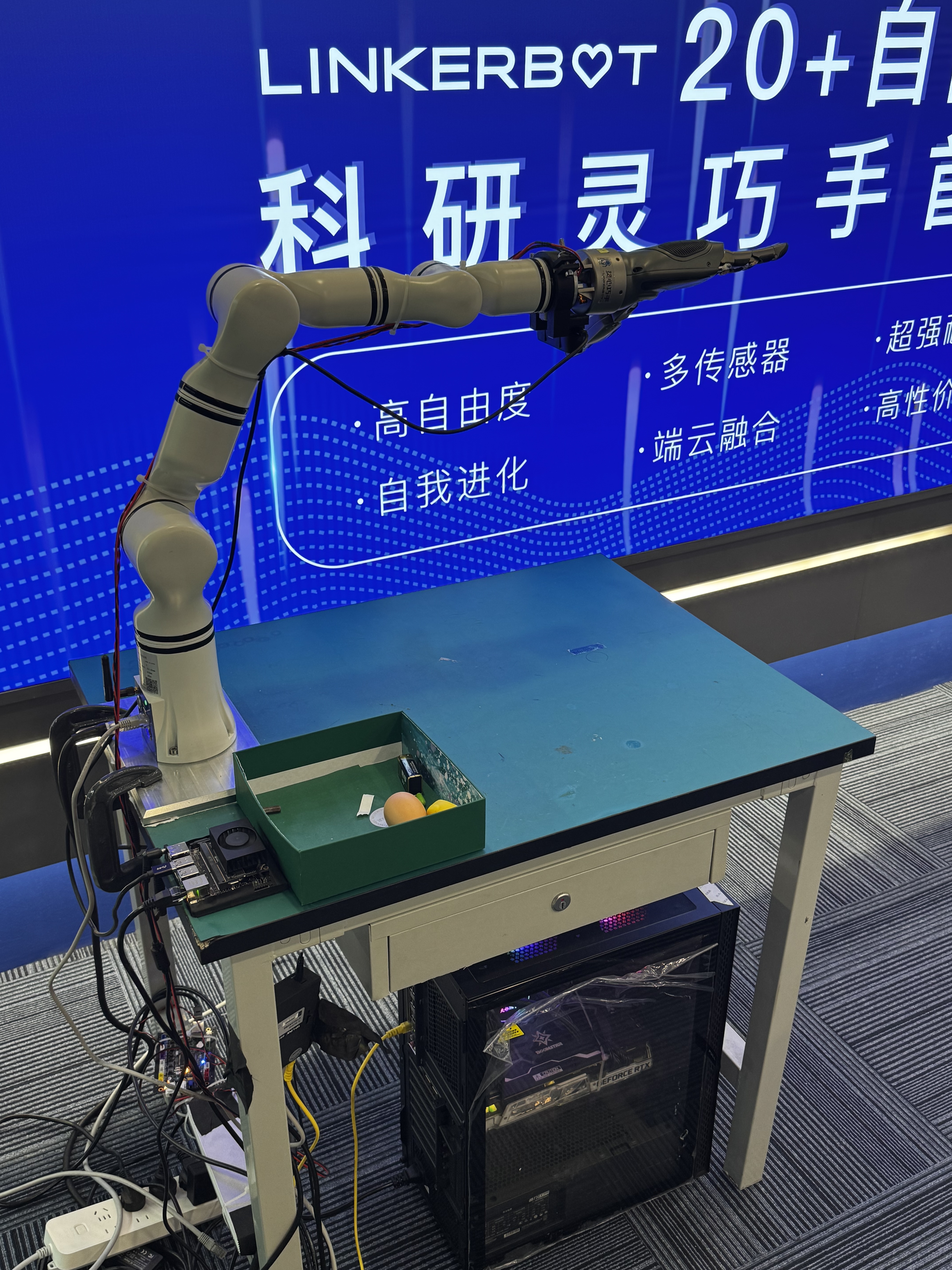 通过机械臂+灵巧手+视觉摄像头的硬件组合,对台面物体进行实时的视觉识别和定位,操控灵巧手变换为最合适的抓取手型并进行抓取