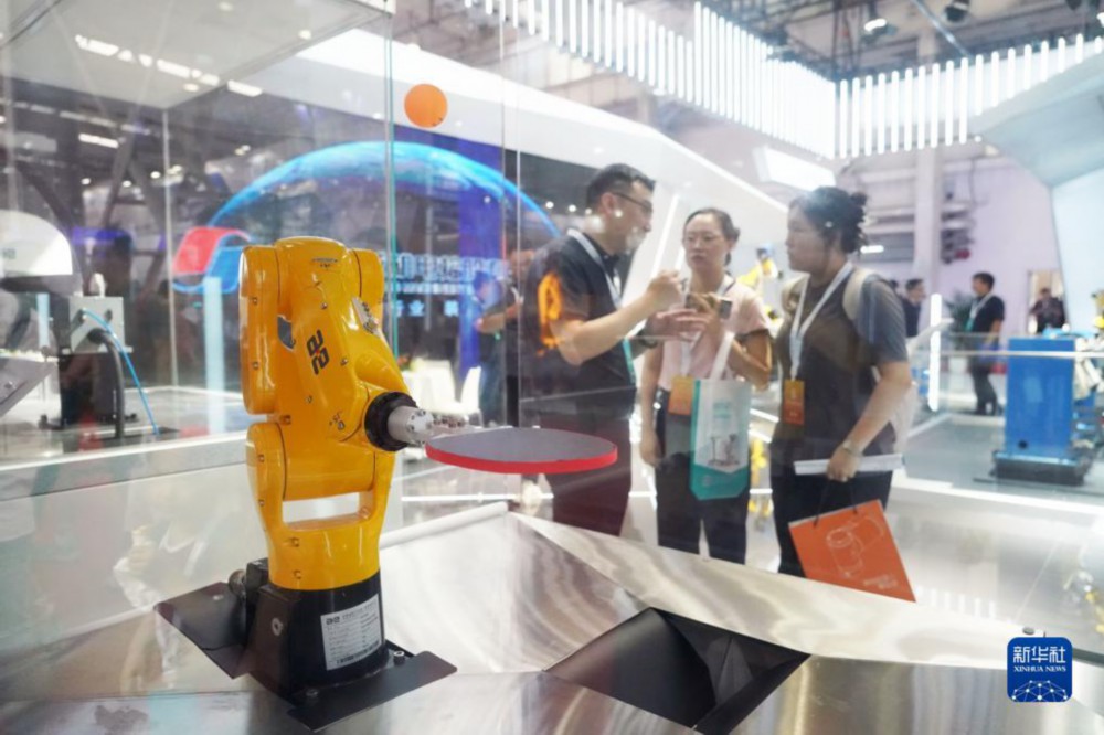 8月16日在2023世界机器人大会现场拍摄的白车身焊点机器人工作站。