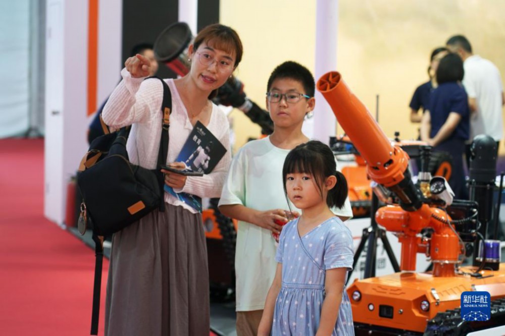8月16日,在2023世界机器人大会现场,具有防火防盗功能的巡逻机器人在执勤。