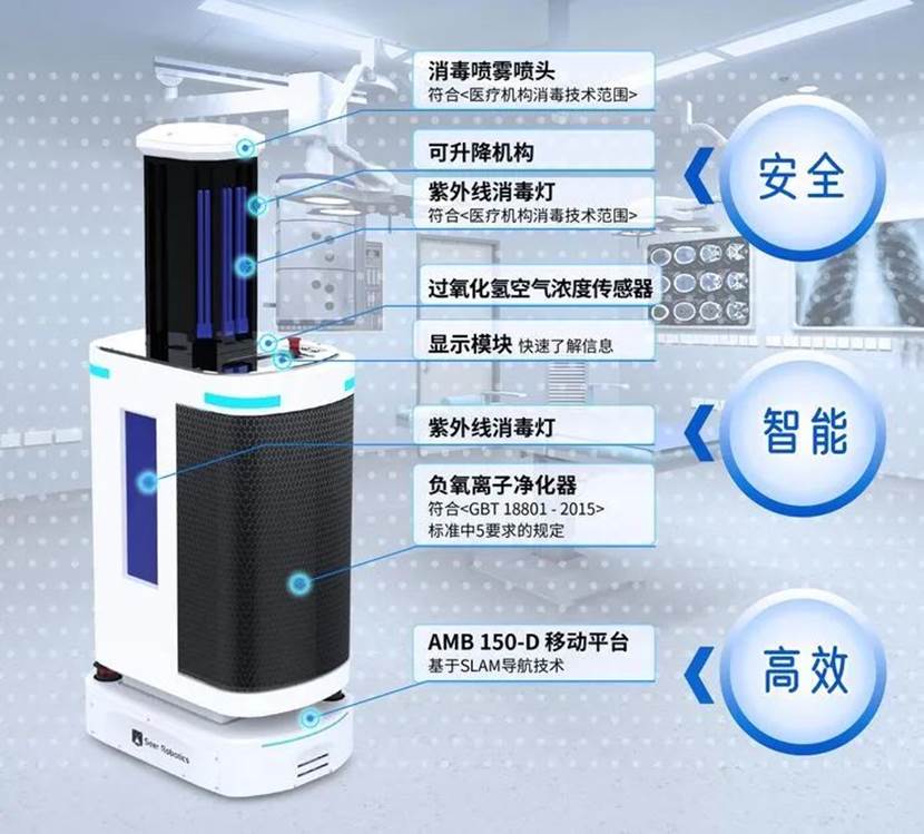 新冠病毒的强传播性,在疫情防控期间,“消毒”是一个非常关键的防护措施,尤其是在医院、发热门诊、人员聚集的工厂车间等这些场所。但是仅仅依靠人工喷洒消毒液难以确保消毒彻底性,也难以保证消毒人员自身安全。面对这样的情况,仙知机器人携手合作伙伴,共同打造了一款基于仙知AMB系列无人搬运底盘的“消毒机器人”。