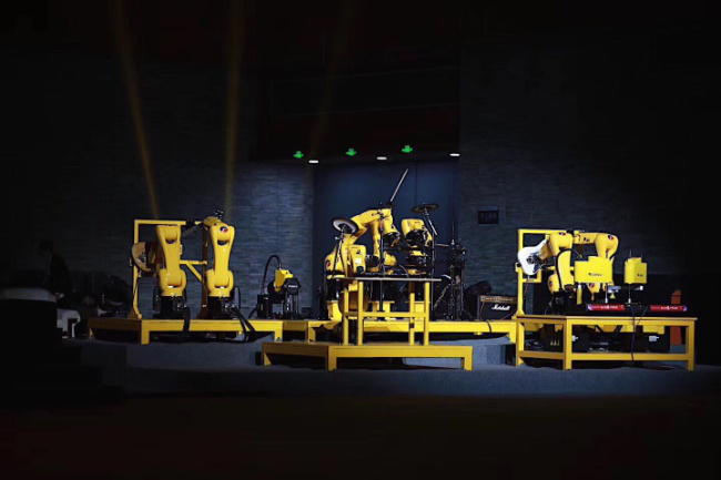 机器人乐队由架子鼓、吉他、贝斯、电子琴、钟琴等五个模块构成,共使用8台GR606工业机器人,2台GRS405水平多关节机器人和1台GRS401水平多关节机器人,通过对机器人的运动状态编程,配合专门的工装夹具,在音乐老师的指导下,完成整个乐曲的演奏。
