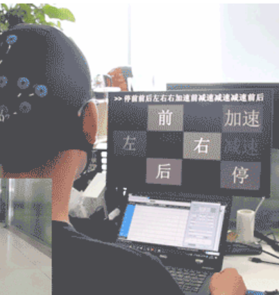 清华大学神经工程实验室研发的脑-机接口基于稳态视觉诱发电位,在接受按一定频率闪烁的视觉刺激后,人脑的枕区能检测到含有和刺激频率同频和倍频成分的头皮脑电,这种借口具有稳定易用,ITR高,无创安全的优点,非常适合用于该控制系统。不同于传统脑机接口机器人常采用的同步控制法——用户需要时刻注视屏幕,缺乏自由性和主动性,清华大学的系统采用实验室提出的异步MSMP空间滤波器组算法进行异步控制。