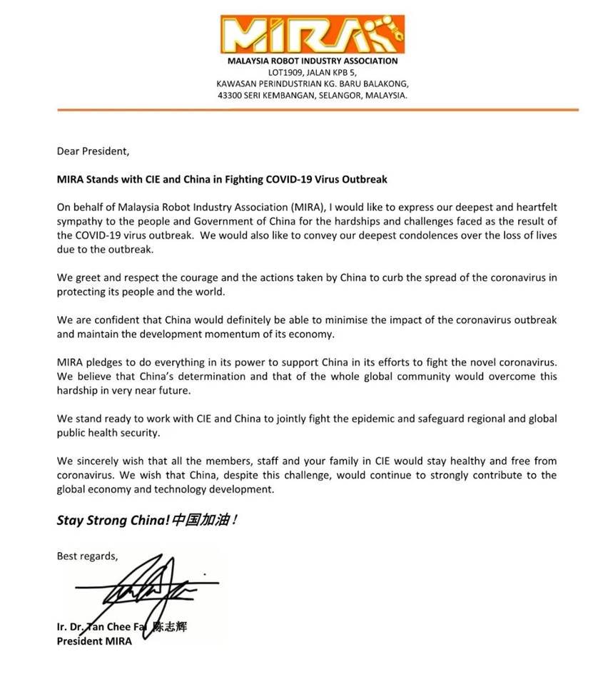 马来西亚工业机器人协会主席Chee FaiTan在回信中说: “首先,我代表马来西亚工业机器人协会,向因这场疫情而遭受困难和挑战的中国政府和人民深表同情。对因感染病毒不幸去世的生命表示深切哀悼。为了全世界人民,感谢中国政府和人民在疫情防控工作中做出的巨大努力。我们坚信,中国一定能够做好疫情防控工作,中国经济也会继续健康发展。”