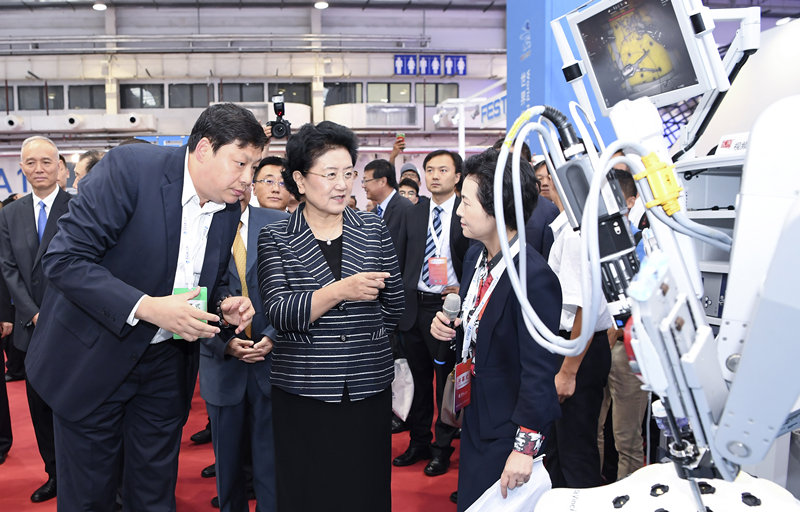 8月23日,2017世界机器人大会开幕式在北京举行,中共中央政治局委员、国务院副总理刘延东出席并讲话。这是开幕式后,刘延东参观机器人应用展览。新华社记者 张领 摄